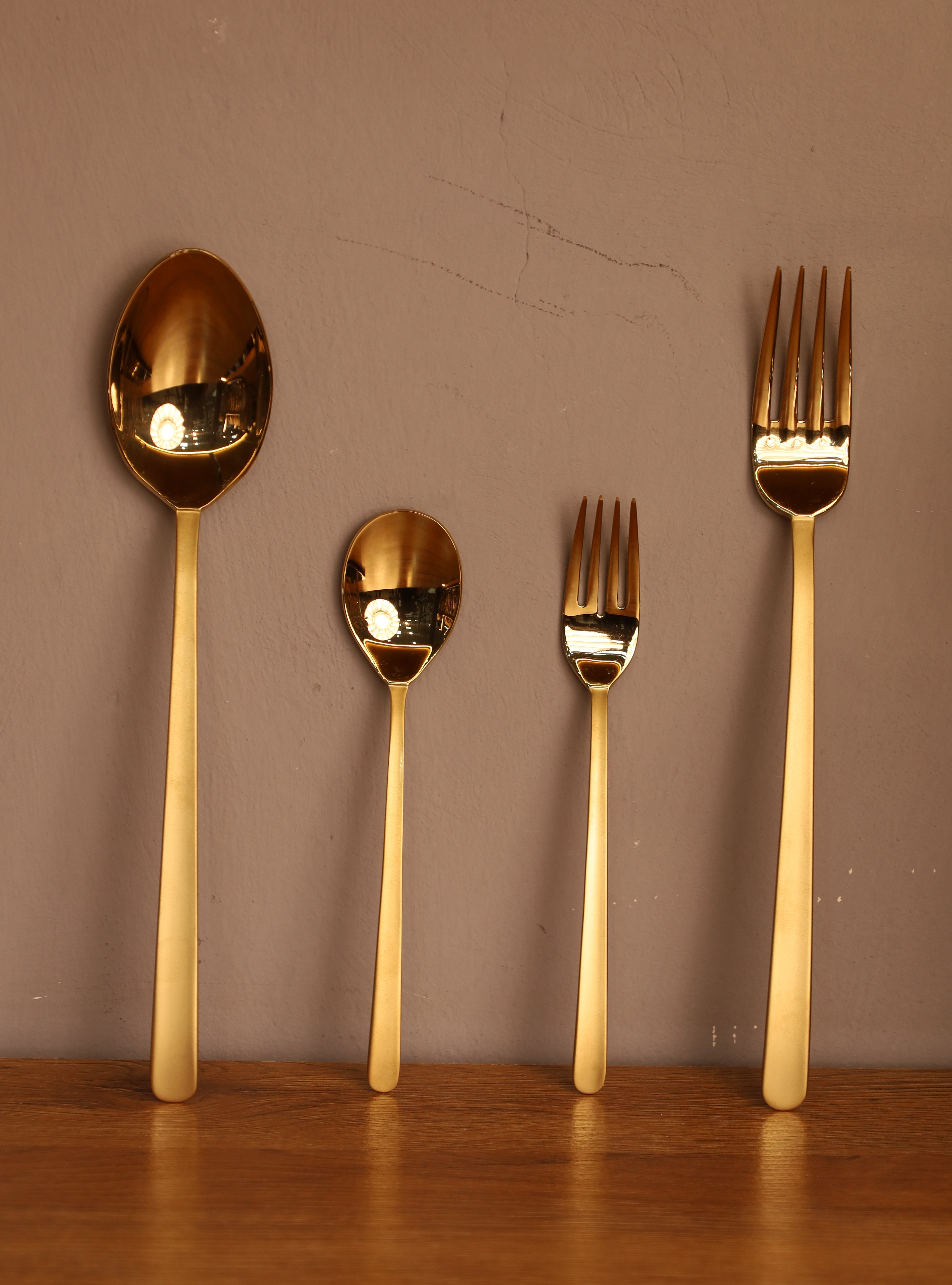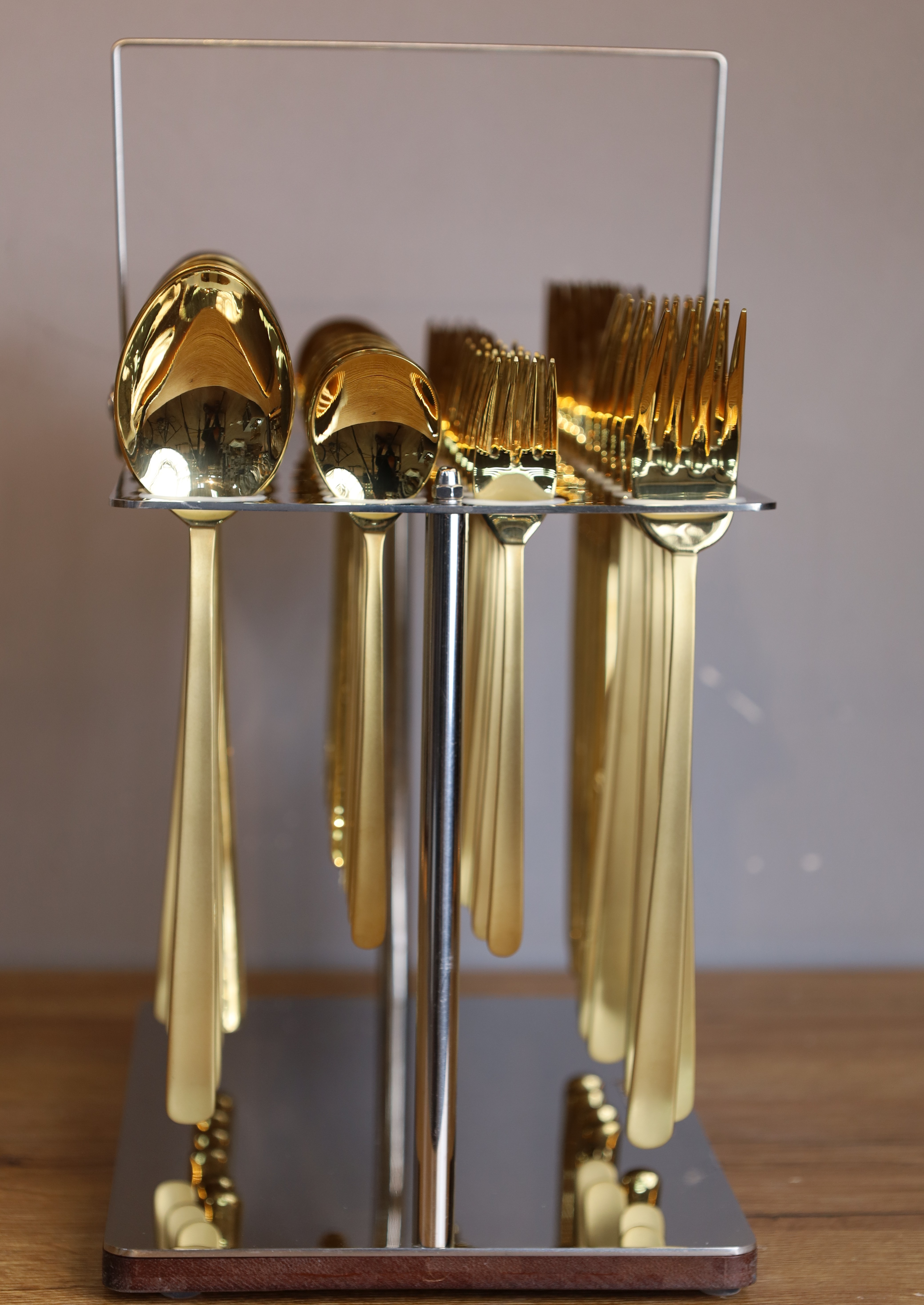 فولاد ضد زنگ ۱۸/۱۰ (۱۸٪ کروم، ۱۰٪ نیکل) برای استحکام برتر مقاوم در برابر زنگزدگی و بادوام طلای جلا داده شده برای ظاهری لوکس و زیبا دستههای ارگونومیک با وزن متعادل برای استفاده راحت این سرویس شامل موارد زیر است: