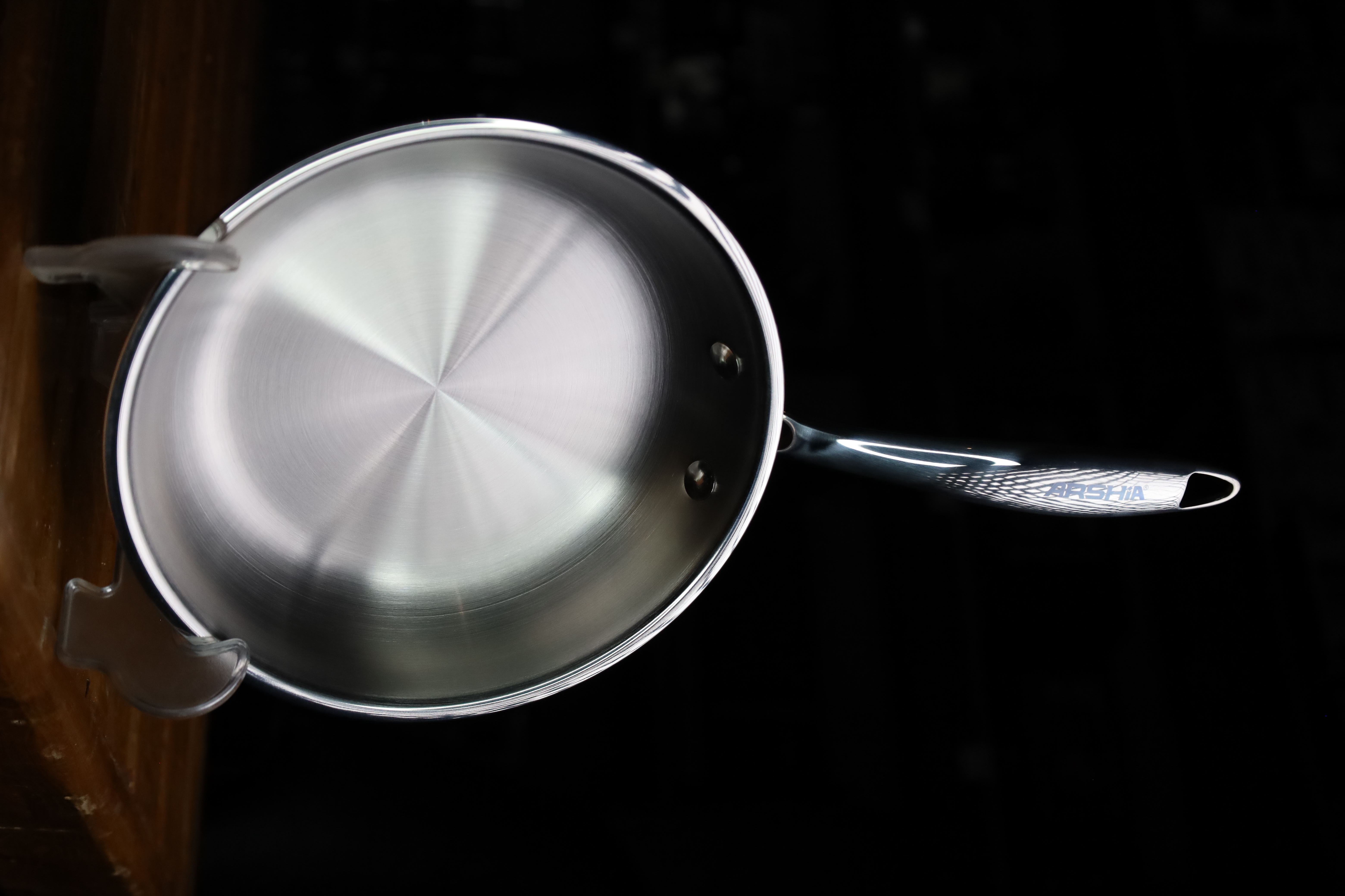 یکی از مهمترین ویژگیهای این ماهیتابه، جنس بدنه استیل ضدزنگ 18/10 آن است که مقاومت فوقالعادهای در برابر زنگزدگی، خوردگی و خطوخش دارد. این نوع استیل نهتنها ظاهر براق و زیبا دارد، بلکه با دوام بالا، برای استفاده روزمره بسیار مناسب است. ساختار سهلایه (Tri-Ply) این ماهیتابه باعث شده تا حرارت بهصورت یکنواخت در تمام سطح پخش شود و از ایجاد نقاط داغ جلوگیری شود. اگر بهدنبال خرید ماهیتابه استیل با کیفیت بالا هستید، این مدل عرشیا گزینهای بینظیر است.