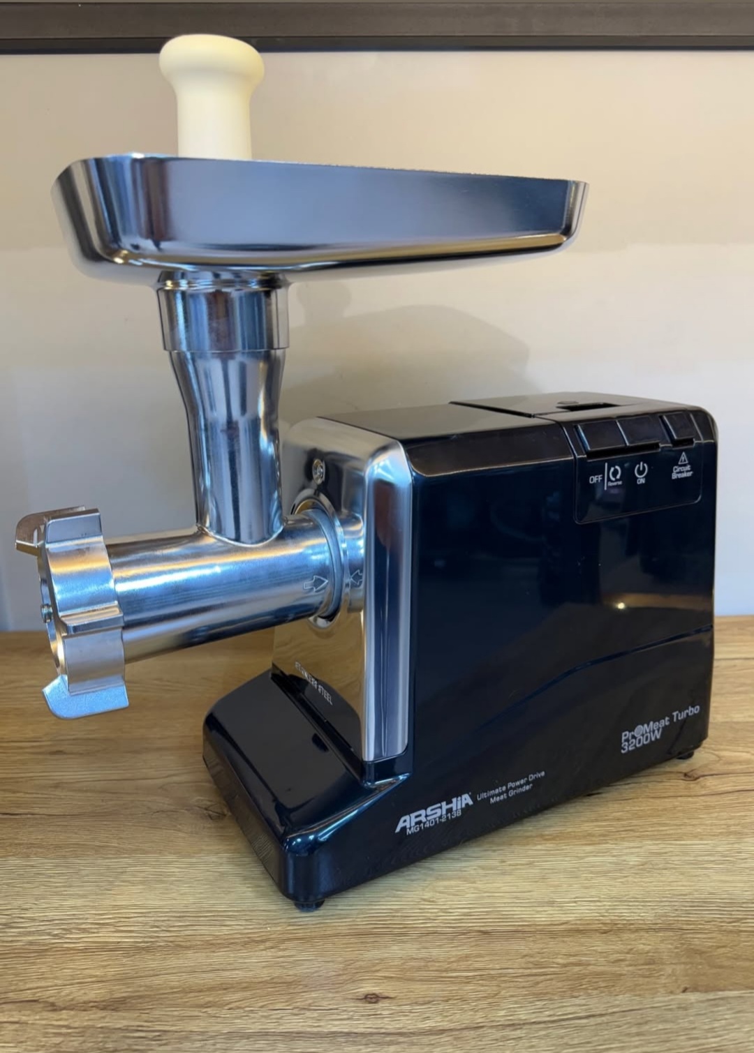 چرخ گوشت برقی عرشیا MG1401-2138 دارای فناوری پیشرفته و طراحی منحصر به فردی است. ابعاد این چرخ گوشت بسیار مناسب است که به فضای کمی نیاز دارد. این چرخ گوشت دارای توان 3200 وات است. این چرخ گوشت از سیستم چرخش معکوس موتور برخوردار است. زمانی که دهانه دستگاه مسدود شود با این قابلیت می توان آن را رها کرد. پایه های این چرخ گوشت ضد لغزش می باشند که مانع از سر خوردن چرخ گوشت می شود.
