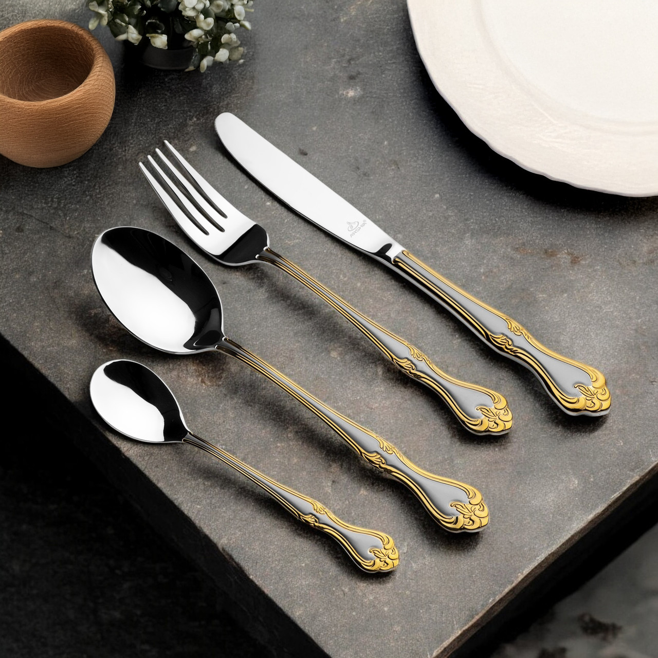 این سرویس قاشق و چنگال ۴۸ پارچه طلایی-نقرهای که با مهارت و ظرافت ساخته شده و دوام و زیبایی بینظیری دارد، به هر مهمانی و مراسمی، جلوهای از تجمل و زیبایی را هدیه میدهد. این سرویس با تعادل و پرداختی زیبا، انتخابی ایدهآل برای یک چیدمان میز شیک و مجلل است.