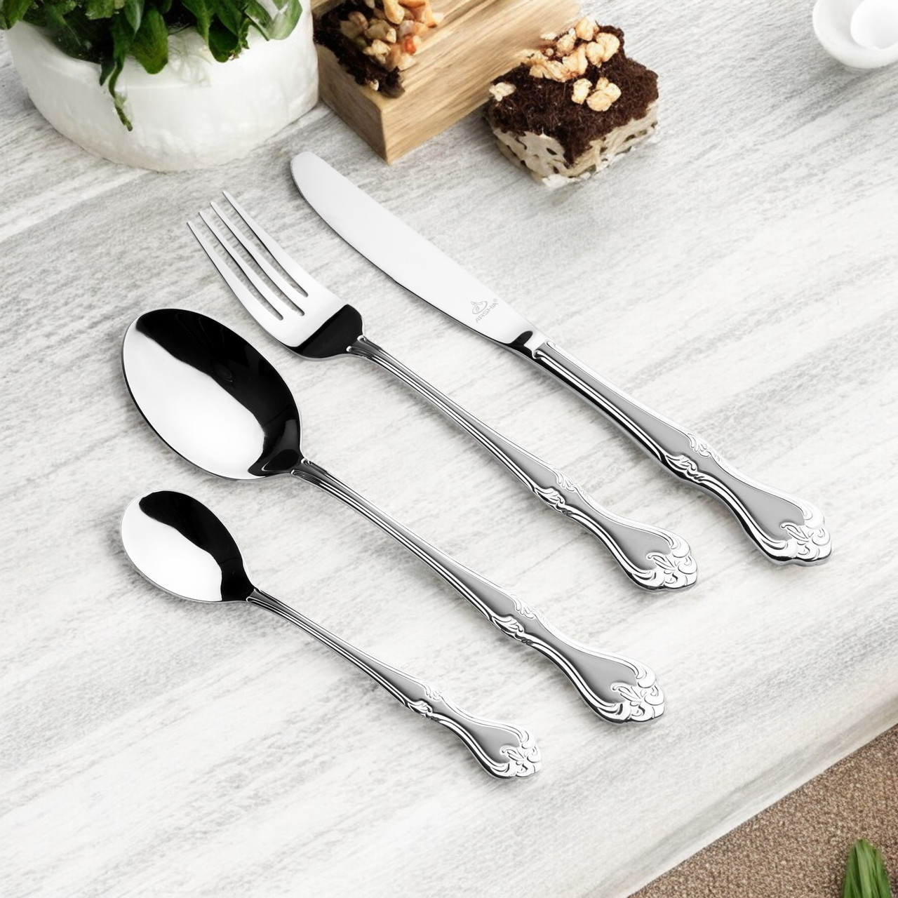 این سرویس قاشق و چنگال نقرهای ۴۸ پارچه که با مهارت و ظرافت ساخته شده و دوام و زیبایی بینظیری دارد، به هر مهمانی و مراسمی، جلوهای از تجمل و زیبایی را هدیه میدهد. این سرویس با تعادل و پرداختی زیبا، انتخابی ایدهآل برای یک چیدمان میز شیک و مجلل است.